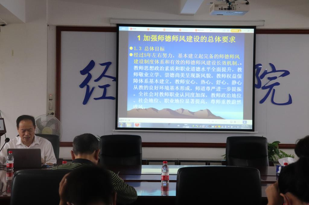 3118云顶集团官网为深入学习贯彻习近平新时代中国特色社会主义思想,落实立德树人根本任务,于11月23日下午在广学楼718召开师德巡讲报告会。会议邀请到学校师德宣讲团成员闫玉科教授进行宣讲。3118云顶集团官网全体教职工共43人参加会议。会议由学院党委书记陈创主持。